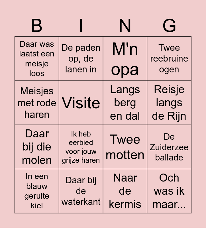 This bingo card has 16 words: Daar bij de waterkant, De Zuiderzee ballade, M'n opa, Daar was laatst een meisje loos, Daar bij die molen, De paden op, de lanen in, Twee motten, Naar de kermis, Meisjes met rode haren, Visite, In een blauw geruite kiel, Twee reebruine ogen, Ik heb eerbied voor jouw grijze haren, Reisje langs de Rijn, Langs berg en dal and Och was ik maar....