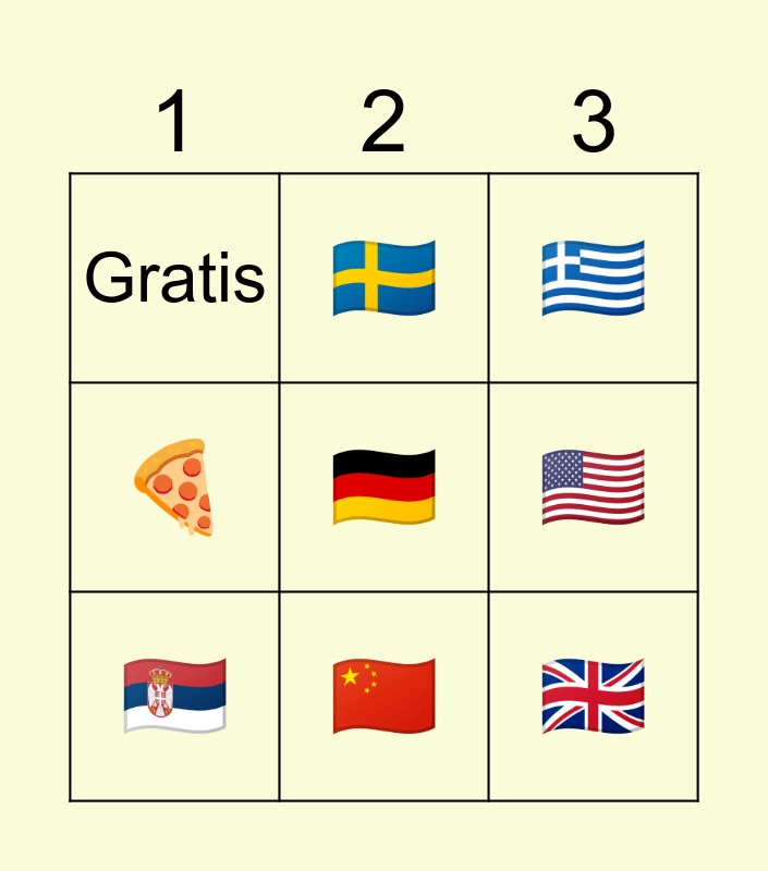 This bingo card has 9 words: π·πΈ, π¬π·, πΈπͺ, π, Gratis, πΊπΈ, π©πͺ, π¬π§ and π¨π³.