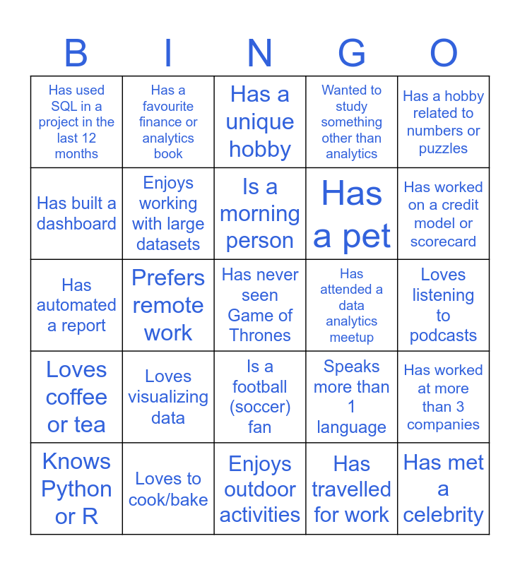 This bingo card has a free space and 24 words: Loves visualizing data, Loves to cook/bake, Is a morning person, Knows Python or R, Has a hobby related to numbers or puzzles, Has used SQL in a project in the last 12 months, Has built a dashboard, Has a favourite finance or analytics book, Has attended a data analytics meetup, Is a football (soccer) fan, Has a pet, Has automated a report, Speaks more than 1 language, Has worked at more than 3 companies, Enjoys working with large datasets, Has travelled for work, Loves listening to podcasts, Has a unique hobby, Has worked on a credit model or scorecard, Prefers remote work, Has met a celebrity, Loves coffee or tea, Wanted to study something other than analytics and Enjoys outdoor activities.