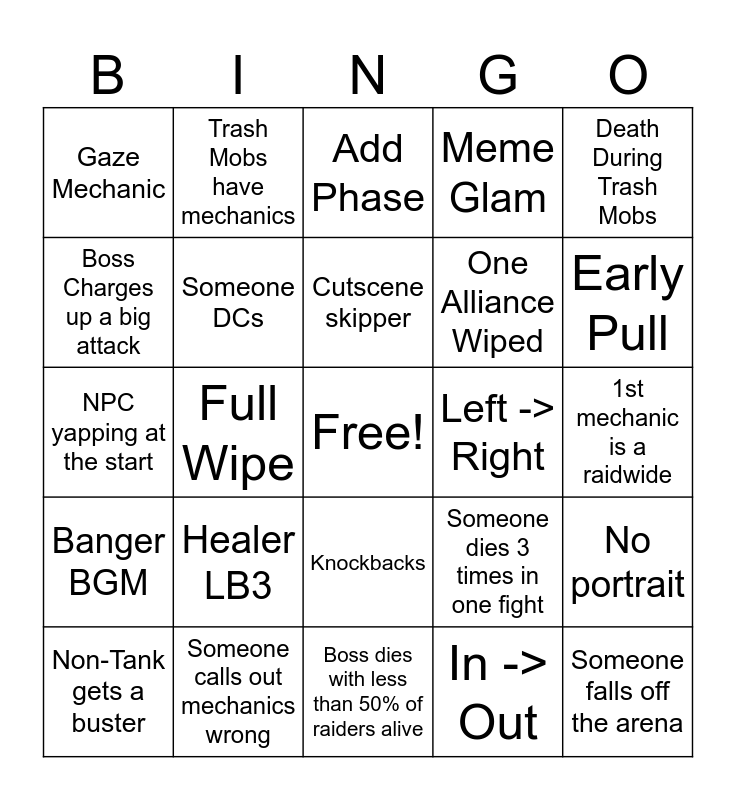 This bingo card has a free space and 24 words: Healer LB3, Someone calls out mechanics wrong, Cutscene skipper, Non-Tank gets a buster, Death During Trash Mobs, Gaze Mechanic, Boss Charges up a big attack, Trash Mobs have mechanics, Left -> Right, Knockbacks, One Alliance Wiped, NPC yapping at the start, Someone dies 3 times in one fight, No portrait, Someone DCs, In -> Out, 1st mechanic is a raidwide, Add Phase, Early Pull, Full Wipe, Someone falls off the arena, Banger BGM, Meme Glam and Boss dies with less than 50% of raiders alive.