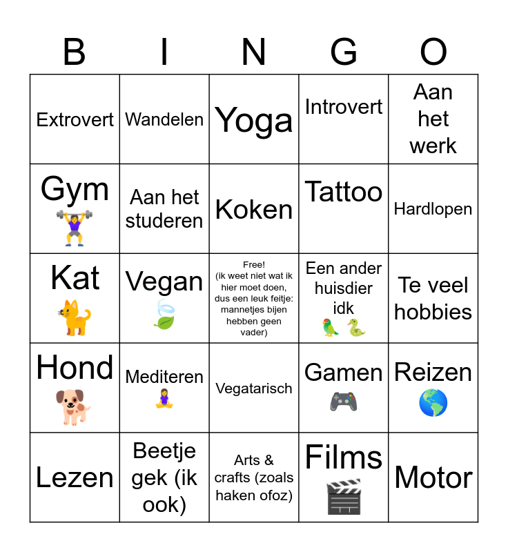 This bingo card has a free space and 24 words: Mediteren 🧘♀️, Beetje gek (ik ook), Koken, Lezen, Aan het werk, Extrovert, Gym 🏋️♀️, Wandelen, Een ander huisdier idk 🦜 🐍, Vegatarisch, Tattoo, Kat 🐈, Gamen 🎮, Reizen 🌎, Aan het studeren, Films 🎬, Te veel hobbies, Yoga, Hardlopen, Vegan 🍃, Motor, Hond 🐕, Introvert and Arts & crafts (zoals haken ofoz).