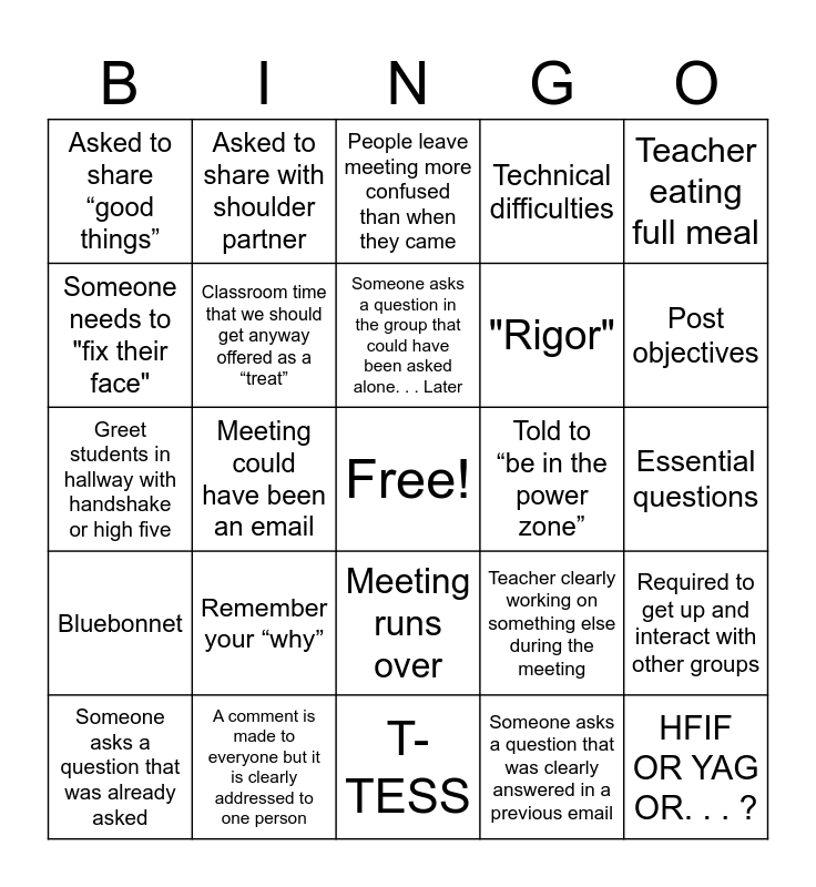 This bingo card has a free space and 24 words: Remember your “why”, A comment is made to everyone but it is clearly addressed to one person, Someone asks a question in the group that could have been asked alone. . . Later, Someone asks a question that was already asked, Teacher eating full meal, Asked to share “good things”, Someone needs to "fix their face", Asked to share with shoulder partner, Told to “be in the power zone”, Meeting runs over, "Rigor", Greet students in hallway with handshake or high five, Teacher clearly working on something else during the meeting, Required to get up and interact with other groups, Classroom time that we should get anyway offered as a “treat”, Someone asks a question that was clearly answered in a previous email, Essential questions, People leave meeting more confused than when they came, Post objectives, Meeting could have been an email, HFIF OR YAG OR. . . ?, Bluebonnet, Technical difficulties and T-TESS.