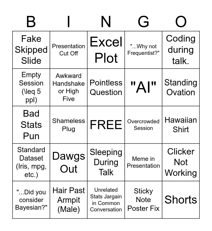 This bingo card has a free space and 24 words: Dawgs Out, Hair Past Armpit (Male), Pointless Question, "...Did you consider Bayesian?", Coding during talk., Fake Skipped Slide, Empty Session (\leq 5 ppl), Presentation Cut Off, Overcrowded Session, Sleeping During Talk, "AI", Bad Stats Pun, Meme in Presentation, Clicker Not Working, Awkward Handshake or High Five, Sticky Note Poster Fix, Hawaiian Shirt, Excel Plot, Standing Ovation, Shameless Plug, Shorts, Standard Dataset (Iris, mpg, etc.), "...Why not Frequentist?" and Unrelated Stats Jargain in Common Conversation.