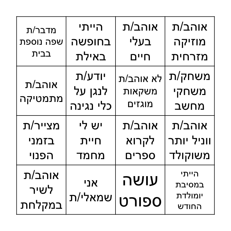 This bingo card has 20 words: אוהב/ת ווניל יותר משוקולד, ראיתי סדרה בנטפליקס השבוע, אוהב/ת בעלי חיים, יש לי יותר משלושה אחים/ות, אוהב/ת לשיר במקלחת, אוהב/ת מתמטיקה, אני שמאלי/ת, מדבר/ת שפה נוספת בבית, מצייר/ת בזמני הפנוי, הייתי בחופשה באילת, יש לי חיית מחמד, אוהב/ת לקרוא ספרים, יודע/ת לנגן על כלי נגינה, הייתי במסיבת יומולדת החודש, לא אוהב/ת משקאות מוגזים, יש לי כתם לידה, משחק/ת משחקי מחשב, אוהב/ת מוזיקה מזרחית, עושה ספורט and אני ילד/ה בכורה.