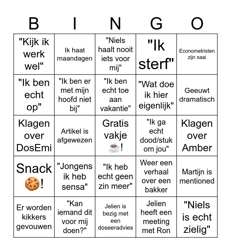 This bingo card has a free space and 28 words: Martijn is mentioned, Ik ben zó moe, "Wat doe ik hier eigenlijk", Jelien heeft een meeting met Ron, "Ik ben echt op", "Niels haalt nooit iets voor mij", Ik haat maandagen, Snack🍪!, "Ik ga echt dood/stuk om jou", Er worden kikkers gevouwen, Klagen over DosEmi, "Ik sterf", "Kan iemand dit voor mij doen?", Jelien is bezig met een doseeradvies, Geeuwt dramatisch, "Iemand water?", "Jongens ik heb sensa", "Ik ben er met mijn hoofd niet bij", "Ik ben echt toe aan vakantie", "Ik heb echt geen zin meer", "Kijk ik werk wel", Scrollt doelloos op telefoon, "Niels is echt zielig", Artikel is afgewezen, Klagen over Amber, Weer een verhaal over een bakker, Econometristen zijn saai and Konrad.