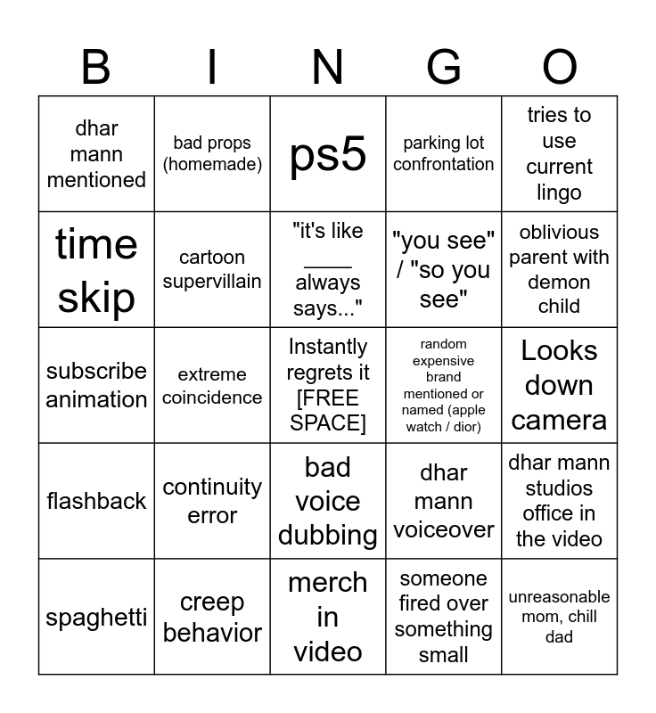 This bingo card has a free space and 27 words: dhar mann voiceover, dhar car, "you see" / "so you see", merch in video, time skip, ps5, bad props (homemade), flashback, random expensive brand mentioned or named (apple watch / dior), dhar mann studios office in the video, subscribe animation, parking lot confrontation, spaghetti, creep behavior, oblivious parent with demon child, kids with ipad, cartoon supervillain, "it's like ____ always says...", continuity error, dhar mann mentioned, Looks down camera, someone fired over something small, extreme coincidence, unreasonable mom, chill dad, bad voice dubbing, tries to use current lingo and children doing highschool math.