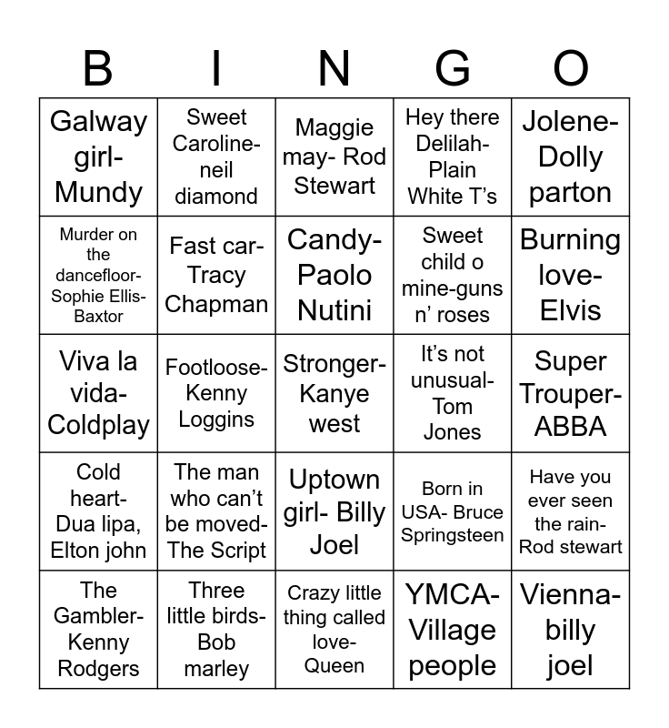 This bingo card has 35 words: Wake me up- Avicii, A sky full of stars-Coldplay, Summer of 69-Bryan Adam, Fast car- Tracy Chapman, Uptown girl- Billy Joel, Hey there Delilah- Plain White T’s, Murder on the dancefloor- Sophie Ellis-Baxtor, Don’t stop believin- journey, Candy- Paolo Nutini, Little lion man- Mumford & sons, Viva la vida- Coldplay, Jolene-Dolly parton, Suspicious minds-Elvis Presely, Dancing in the dark-Bruce Springsteen, Galway girl-Mundy, It’s not unusual-Tom Jones, YMCA-Village people, Footloose-Kenny Loggins, Cold heart- Dua lipa, Elton john, Stronger- Kanye west, Born in USA- Bruce Springsteen, The Gambler-Kenny Rodgers, Have you ever seen the rain-Rod stewart, Three little birds-Bob marley, Maggie may- Rod Stewart, Burning love- Elvis, Vienna-billy joel, Dancing queen-ABBA, Sweet child o mine-guns n’ roses, Super Trouper-ABBA, Red Red wine- UB40, Crazy little thing called love- Queen, The man who can’t be moved- The Script, Sweet Caroline- neil diamond and Rocket man- Elton John.