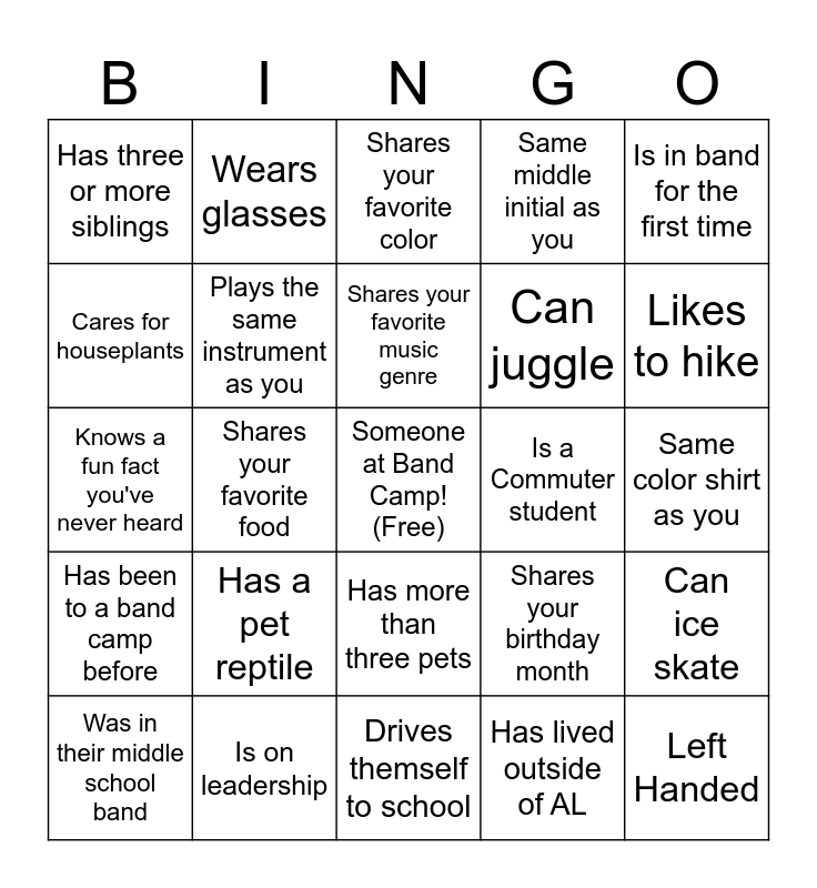 This bingo card has a free space and 39 words: Has colored hair, Knows a different language, Plays Multiple instruments, Plays the same instrument as you, Was in their middle school band, Has more than three pets, Shares your favorite music genre, Is a Res student, Is in band for the first time, Has been to a band camp before, Shares your favorite food, Same middle initial as you, Left Handed, Same color shirt as you, Is a Commuter student, Has a pet reptile, Same hobby as you, Has three or more siblings, Plays sports, Shares your birthday month, Cares for houseplants, Drives themself to school, Can juggle, Likes to hike, Has been to the Space and Rocket Center, Has been to a rock concert, Travelled internationally, Has met a celebrity, Can do a handstand, Wears glasses, Has been skiing, Has a food allergy, Shares your favorite color, Is on leadership, Has lived outside of AL, Is an only child, Can ice skate, Knows a fun fact you've never heard and Shares a different club with you.