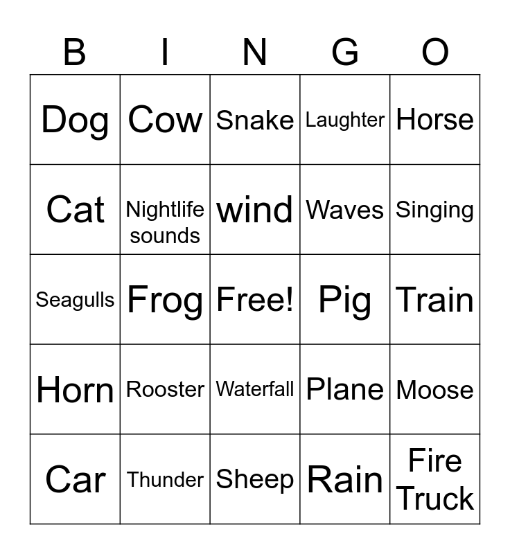 This bingo card has a free space and 26 words: Waterfall, Rain, wind, Thunder, Horse, Dog, Cat, Cow, Train, Plane, Waves, Seagulls, Moose, Car, Frog, Music, Laughter, Horn, Snake, Fire Truck, Singing, Sheep, Pig, Rooster, Nightlife sounds and Bells.