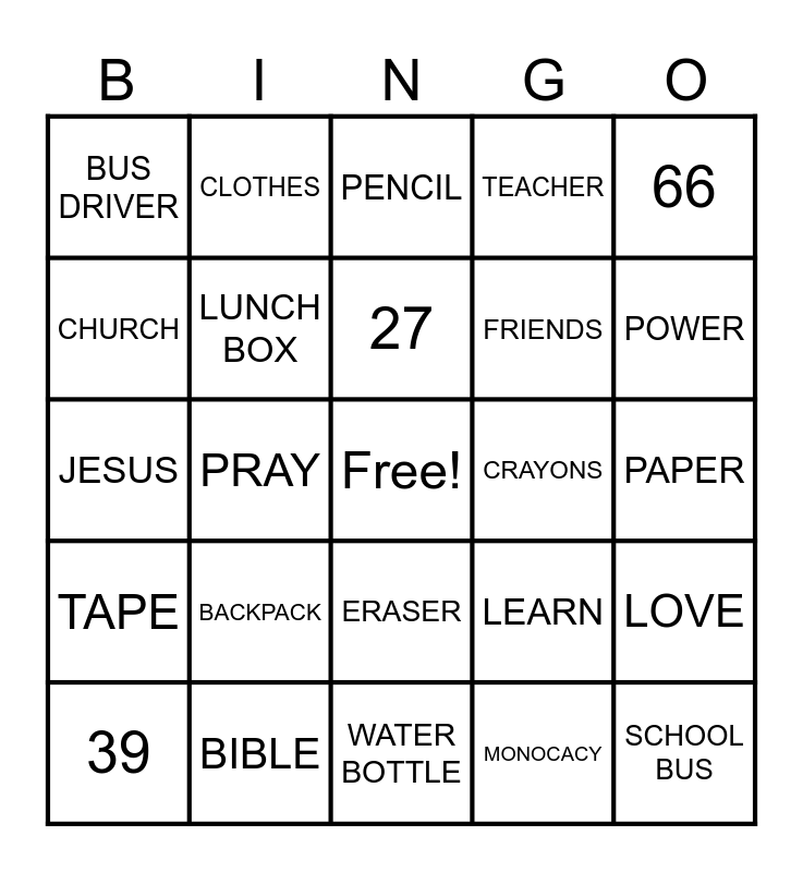 This bingo card has a free space and 24 words: BACKPACK, BIBLE, 27, 39, 66, BUS DRIVER, CHURCH, CLOTHES, CRAYONS, ERASER, FRIENDS, JESUS, LEARN, LOVE, LUNCH BOX, MONOCACY, PAPER, PENCIL, POWER, PRAY, SCHOOL BUS, TAPE, TEACHER and WATER BOTTLE.