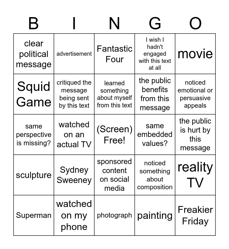 This bingo card has a free space and 24 words: Sydney Sweeney, watched on my phone, learned something about myself from this text, Superman, movie, clear political message, Squid Game, advertisement, same embedded values?, sponsored content on social media, the public benefits from this message, same perspective is missing?, noticed something about composition, reality TV, critiqued the message being sent by this text, painting, the public is hurt by this message, Fantastic Four, noticed emotional or persuasive appeals, watched on an actual TV, Freakier Friday, sculpture, I wish I hadn't engaged with this text at all and photograph.