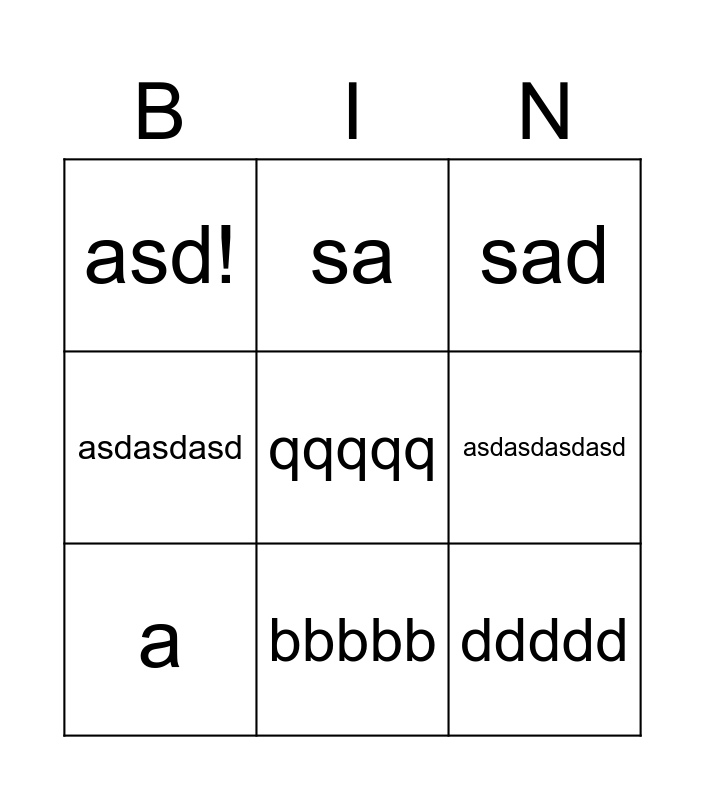 This bingo card has 9 words: a, sad, sa, asdasdasd, asd!, asdasdasdasd, qqqqq, ddddd and bbbbb.