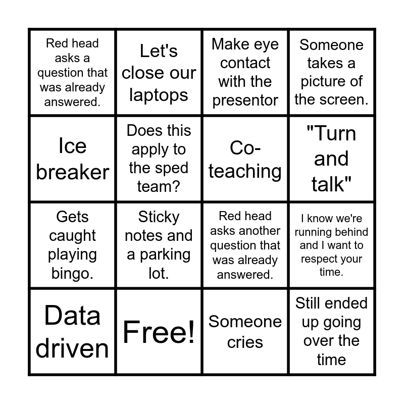 This bingo card has 16 words: Free!, I know we're running behind and I want to respect your time., Make eye contact with the presentor, Red head asks a question that was already answered., Gets caught playing bingo., Let's close our laptops, Red head asks another question that was already answered., Someone cries, Ice breaker, Does this apply to the sped team?, Data driven, Someone takes a picture of the screen., Sticky notes and a parking lot., "Turn and talk", Co-teaching and Still ended up going over the time.