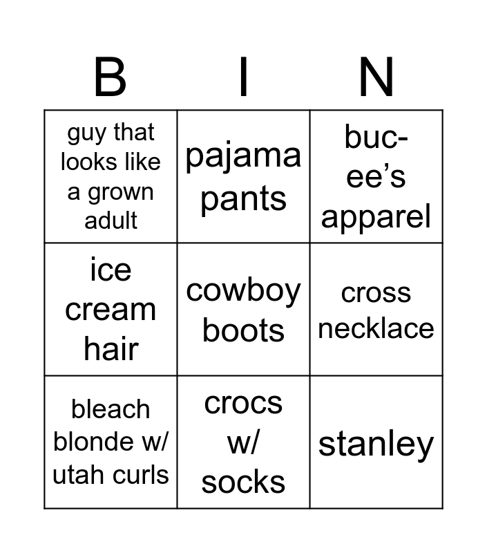 This bingo card has 9 words: bleach blonde w/ utah curls, buc-ee’s apparel, pajama pants, ice cream hair, guy that looks like a grown adult, cross necklace, cowboy boots, stanley and crocs w/ socks.