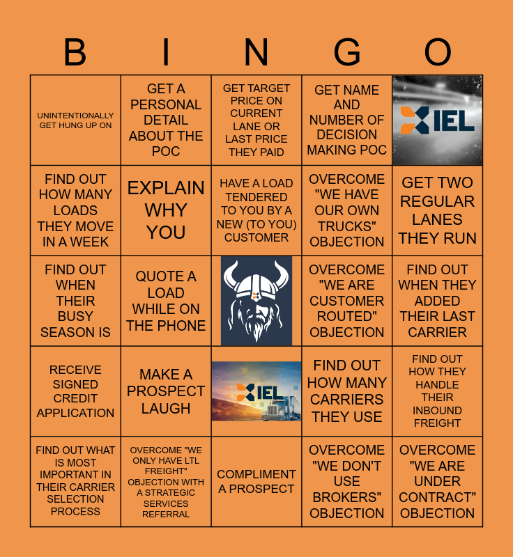 This bingo card has 3 images, a free space and 24 words: FIND OUT HOW MANY CARRIERS THEY USE, GET A RESPONSE TO AN INTRO EMAIL, OVERCOME "WE HAVE OUR OWN TRUCKS" OBJECTION, COMPLIMENT A PROSPECT, FIND OUT HOW MANY LOADS THEY MOVE IN A WEEK, GET TARGET PRICE ON CURRENT LANE OR LAST PRICE THEY PAID, GET A PERSONAL DETAIL ABOUT THE POC, RECEIVE SIGNED CREDIT APPLICATION, OVERCOME "WE ARE CUSTOMER ROUTED" OBJECTION, FIND OUT HOW THEY HANDLE THEIR INBOUND FREIGHT, FIND OUT WHEN THEIR BUSY SEASON IS, GET NAME AND NUMBER OF DECISION MAKING POC, FIND OUT WHAT IS MOST IMPORTANT IN THEIR CARRIER SELECTION PROCESS, OVERCOME "WE ONLY HAVE LTL FREIGHT" OBJECTION WITH A STRATEGIC SERVICES REFERRAL, GET TWO REGULAR LANES THEY RUN, OVERCOME "WE AREN'T ADDING ANY NEW CARRIERS" OBJECTION, EXPLAIN WHY YOU, HAVE A LOAD TENDERED TO YOU BY A NEW (TO YOU) CUSTOMER, MAKE A PROSPECT LAUGH, UNINTENTIONALLY GET HUNG UP ON, FIND OUT WHEN THEY ADDED THEIR LAST CARRIER, OVERCOME "WE DON'T USE BROKERS" OBJECTION, QUOTE A LOAD WHILE ON THE PHONE and OVERCOME "WE ARE UNDER CONTRACT" OBJECTION.