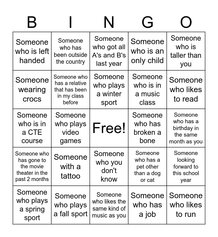 This bingo card has a free space and 24 words: Someone with a tattoo, Someone who plays a fall sport, Someone who plays a winter sport, Someone who plays a spring sport, Someone who is taller than you, Someone who is left handed, Someone wearing crocs, Someone who has been outside the country, Someone who has broken a bone, Someone who you don't know, Someone who is in a music class, Someone who is in a CTE course, Someone who has a pet other than a dog or cat, Someone looking forward to this school year, Someone who has a relative that has been in my class before, Someone who has a job, Someone who has a birthday in the same month as you, Someone who got all A's and B's last year, Someone who likes to read, Someone who plays video games, Someone who likes to run, Someone who has gone to the movie theater in the past 2 months, Someone who is an only child and Someone who likes the same kind of music as you.