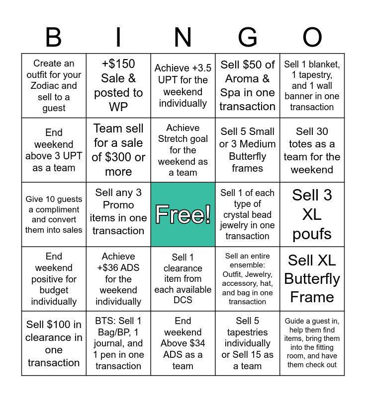 This bingo card has a free space and 24 words: Achieve +$36 ADS for the weekend individually, BTS: Sell 1 Bag/BP, 1 journal, and 1 pen in one transaction, Achieve Stretch goal for the weekend as a team, Sell $100 in clearance in one transaction, Sell 1 blanket, 1 tapestry, and 1 wall banner in one transaction, Create an outfit for your Zodiac and sell to a guest, End weekend above 3 UPT as a team, +$150 Sale & posted to WP, Sell 1 of each type of crystal bead jewelry in one transaction, Sell 1 clearance item from each available DCS, Sell 5 Small or 3 Medium Butterfly frames, Give 10 guests a compliment and convert them into sales, Sell an entire ensemble: Outfit, Jewelry, accessory, hat, and bag in one transaction, Sell XL Butterfly Frame, Team sell for a sale of $300 or more, Sell 5 tapestries individually or Sell 15 as a team, Sell 3 XL poufs, Achieve +3.5 UPT for the weekend individually, Sell 30 totes as a team for the weekend, Sell any 3 Promo items in one transaction, Guide a guest in, help them find items, bring them into the fitting room, and have them check out, End weekend positive for budget individually, Sell $50 of Aroma & Spa in one transaction and End weekend Above $34 ADS as a team.