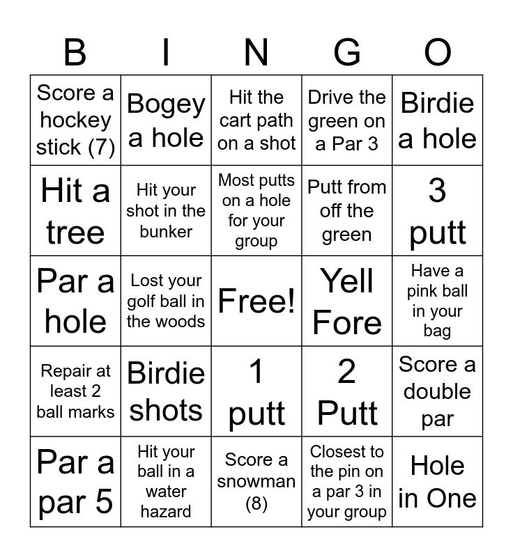 This bingo card has a free space and 30 words: Hit your ball in a water hazard, Get a chip in, Lost your golf ball in the woods, Hit the fairway on your drive, Score a hockey stick (7), Hit the cart path on a shot, Hit your shot in the bunker, 1 putt, Yell Fore, Score a snowman (8), Have a pink ball in your bag, Hole in One, Closest to the pin on a par 3 in your group, Made a putt over 10 feet, 3 putt, Hit out of the bunker on your first try, 2 Putt, Repair at least 2 ball marks, Birdie shots, Birdie a hole, Par a hole, Hit a tree, Bogey a hole, Putt from off the green, Hit a tree, Drive the green on a Par 3, Score a double par, Par a par 5, Most putts on a hole for your group and Hit the green on your 2nd shot.