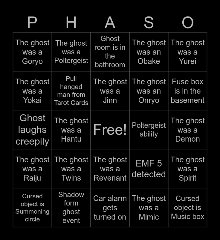 This bingo card has a free space and 67 words: Ghost slams a door, Wrong ghost identified, Bone found in a bathroom, The ghost was a Spirit, The ghost was a Wraith, The ghost was a Phantom, The ghost was a Poltergeist, The ghost was a Banshee, The ghost was a Jinn, The ghost was a Mare, The ghost was a Revenant, The ghost was a Shade, The ghost was a Demon, The ghost was a Yurei, The ghost was an Oni, The ghost was a Yokai, The ghost was a Hantu, The ghost was a Goryo, The ghost was a Myling, The ghost was an Onryo, The ghost was a Twins, The ghost was a Raiju, The ghost was an Obake, The ghost was a Mimic, The ghost was a Moroi, The ghost was a Deogen, The ghost was a Thaye, Ghost hums or sings, Fuse box is in the basement, Ghost interacts with a teddybear, Cursed object is Music box, Cursed object is Mirror, Cursed object is Tarot cards, Cursed object is Voodoo doll, Cursed object is Monkeys paw, Cursed object is Summoning circle, Cursed object is Ouija board, EMF 5 detected, Ghost laughs creepily, Yurei door slam ability, Ghost blows out firelights, Pull hanged man from Tarot Cards, Poltergeist ability, Hunting within 5 minutes of entering the house, All objectives completed, Ghost room in the garage, Sanity drops below 20%, Shadow form ghost event, Mistform ghost event, Ghost exploded the lights, Ghost room is in the bathroom, Ghost throws a shoe, Ghost room is in the kitchen, Crucifix gets burned, Bone is in the kitchen, Car alarm gets turned on, Ghost correctly identified, Only 1 player survives, No hunts during the entire game, 3 Hunts in the game, Survive a hunt, Ghost photo, Video of dots, Lights flickering, Ultraviolet fingerprint on window, Special obake fingerprint and Photo of dead player.