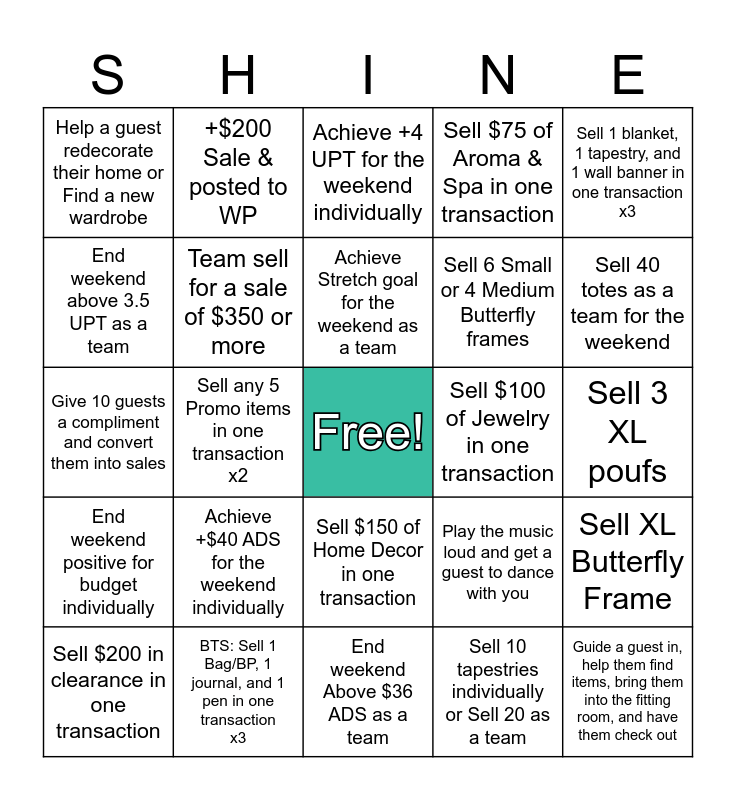 This bingo card has a free space and 24 words: Achieve +$40 ADS for the weekend individually, BTS: Sell 1 Bag/BP, 1 journal, and 1 pen in one transaction x3, Achieve Stretch goal for the weekend as a team, Sell $200 in clearance in one transaction, Sell 1 blanket, 1 tapestry, and 1 wall banner in one transaction x3, Help a guest redecorate their home or Find a new wardrobe, End weekend above 3.5 UPT as a team, +$200 Sale & posted to WP, Sell $100 of Jewelry in one transaction, Sell $150 of Home Decor in one transaction, Sell 6 Small or 4 Medium Butterfly frames, Give 10 guests a compliment and convert them into sales, Play the music loud and get a guest to dance with you, Sell XL Butterfly Frame, Team sell for a sale of $350 or more, Sell 10 tapestries individually or Sell 20 as a team, Sell 3 XL poufs, Achieve +4 UPT for the weekend individually, Sell 40 totes as a team for the weekend, Sell any 5 Promo items in one transaction x2, Guide a guest in, help them find items, bring them into the fitting room, and have them check out, End weekend positive for budget individually, Sell $75 of Aroma & Spa in one transaction and End weekend Above $36 ADS as a team.