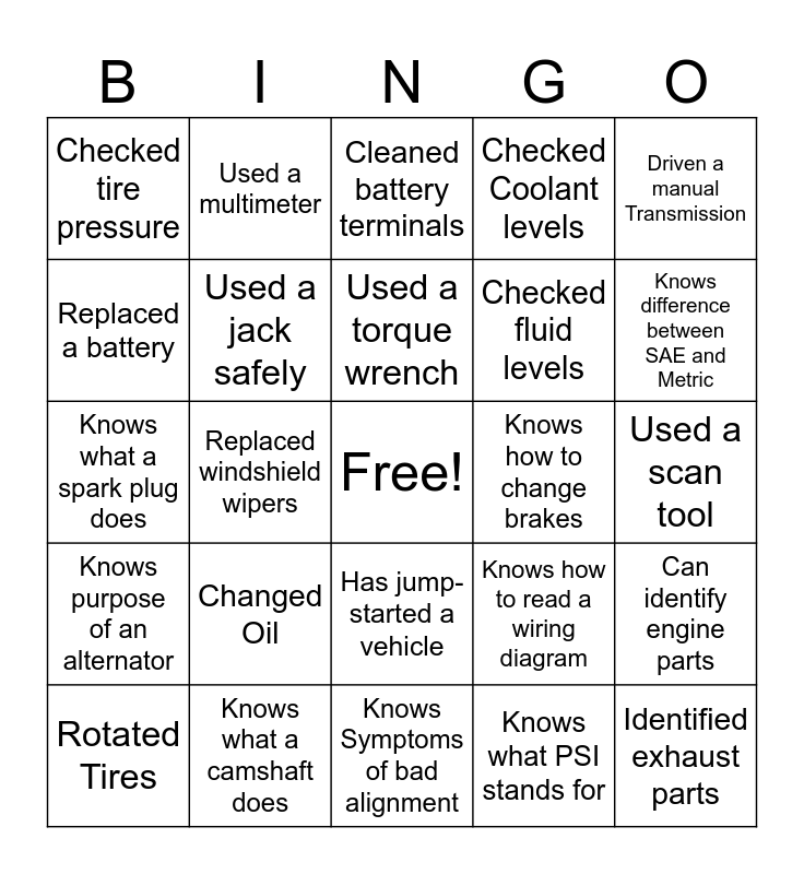 This bingo card has a free space and 24 words: Changed Oil, Knows what a camshaft does, Used a torque wrench, Rotated Tires, Driven a manual Transmission, Checked tire pressure, Replaced a battery, Used a multimeter, Knows how to change brakes, Has jump-started a vehicle, Checked fluid levels, Knows what a spark plug does, Knows how to read a wiring diagram, Can identify engine parts, Used a jack safely, Knows what PSI stands for, Used a scan tool, Cleaned battery terminals, Knows difference between SAE and Metric, Replaced windshield wipers, Identified exhaust parts, Knows purpose of an alternator, Checked Coolant levels and Knows Symptoms of bad alignment.