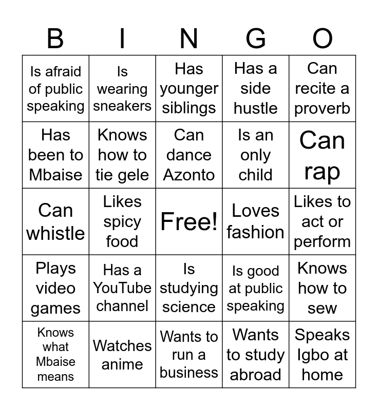 This bingo card has a free space and 120 words: Can cook jollof rice, Oldest sibling, Can braid hair, Speaks 3 languages, Has traveled to another country, Wants to be a doctor, Has a side hustle, Plays a sport, Knows how to sew, Watches Nollywood movies, Has read a book this month, Loves dancing, Is a first-born, Was born in Nigeria, Wants to start a business, Plays an instrument, Is studying science, Is a twin or has one, Loves to draw, Is wearing blue, Knows what Mbaise means, Has younger siblings, Volunteers regularly, Has a part-time job, Loves Afrobeats, Plays video games, Watches anime, Has a mentor, Has a Nigerian name, Knows the meaning of their name, Wants to study abroad, Likes spicy food, Can dance Azonto, Has more than 3 siblings, Is good at math, Likes to read, Has been to Imo State, Wants to be a lawyer, Wants to be an engineer, Participates in church, Follows a Nigerian influencer, Loves rice and stew, Plays basketball, Born in Canada, Can speak Igbo, Took the bus today, Is in university, Loves fashion, Has done a TikTok challenge, Wants to become a leader, Has a pet, Is left-handed, Is good at public speaking, Wants to work in tech, Can swim, Knows someone named Chinedu, Loves suya, Wakes up before 7 AM, Has been on a plane, Is wearing sneakers, Is a good dancer, Was born in August, Likes to write, Has visited Nigeria in the last 5 years, Watches sports, Has been to Mbaise, Can recite a Bible verse, Is in Grade 11 or 12, Wants to be rich (lol), Is wearing glasses, Can whistle, Knows how to make egusi, Loves to sing, Wants to study medicine, Has been to church in the last week, Wants to help others, Is an only child, Likes to journal, Speaks Igbo at home, Has a YouTube channel, Is afraid of public speaking, Wears traditional clothes often, Wants to change the world, Was born in July, Listens to P-square, Is on a school team, Wants to run a business, Has eaten fufu this week, Is learning to code, Has been to a wedding this year, Has cousins in Nigeria, Likes to act or perform, Is taller than you, Wants to be a teacher, Has made a new friend today, Loves plantain, Is the youngest in their family, Can recite a proverb, Likes to paint or draw, Has moved schools before, Likes pounded yam, Has over 3 aunts or uncles, Has a favorite Bible verse, Wants to be a writer, Plays soccer, Knows how to tie gele, Can speak pidgin, Likes to cook, Visited 3 provinces, Wakes up early weekends, Likes group work, Proud of their culture, Can name three Nigerian states, Wants to make a difference, Can rap, Has eaten bitterleaf soup, Can name their village in Mbaise, Attended a Nigerian wedding this year, Knows what “Iri Ji” means and Can say 5 words in Igbo.