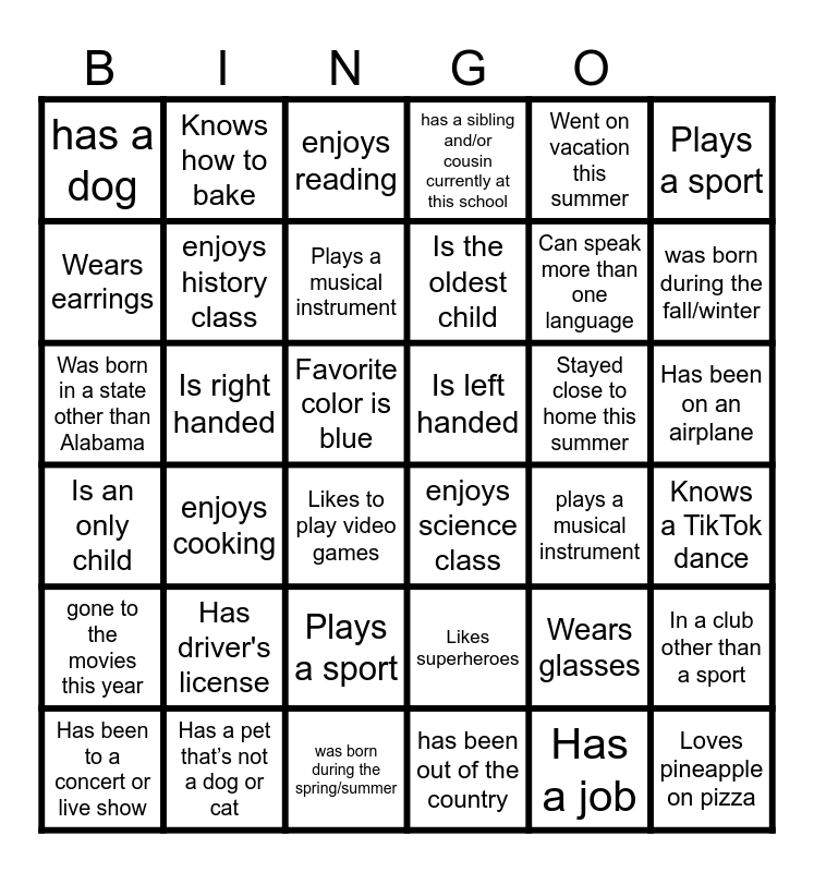 This bingo card has 36 words: Likes superheroes, Plays a sport, has been out of the country, Wears earrings, Is an only child, Is left handed, enjoys history class, was born during the spring/summer, Went on vacation this summer, Wears glasses, was born during the fall/winter, has a sibling and/or cousin currently at this school, In a club other than a sport, Is right handed, Is the oldest child, has a dog, gone to the movies this year, Stayed close to home this summer, Was born in a state other than Alabama, enjoys reading, Favorite color is blue, enjoys cooking, enjoys science class, Likes to play video games, plays a musical instrument, Knows how to bake, Can speak more than one language, Has a pet that’s not a dog or cat, Plays a musical instrument, Plays a sport, Loves pineapple on pizza, Has been to a concert or live show, Knows a TikTok dance, Has been on an airplane, Has driver's license and Has a job.