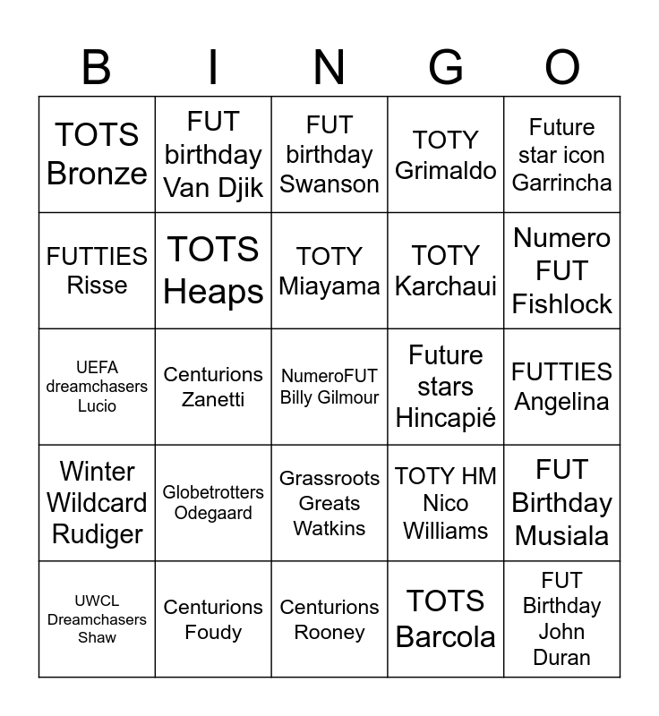 This bingo card has a free space and 24 words: Globetrotters Odegaard, Centurions Foudy, TOTY Miayama, UWCL Dreamchasers Shaw, Future star icon Garrincha, TOTS Bronze, FUTTIES Risse, FUT birthday Van Djik, Future stars Hincapié, Grassroots Greats Watkins, TOTY Karchaui, UEFA dreamchasers Lucio, TOTY HM Nico Williams, FUT Birthday Musiala, TOTS Heaps, TOTS Barcola, FUTTIES Angelina, FUT birthday Swanson, Numero FUT Fishlock, Centurions Zanetti, FUT Birthday John Duran, Winter Wildcard Rudiger, TOTY Grimaldo and Centurions Rooney.