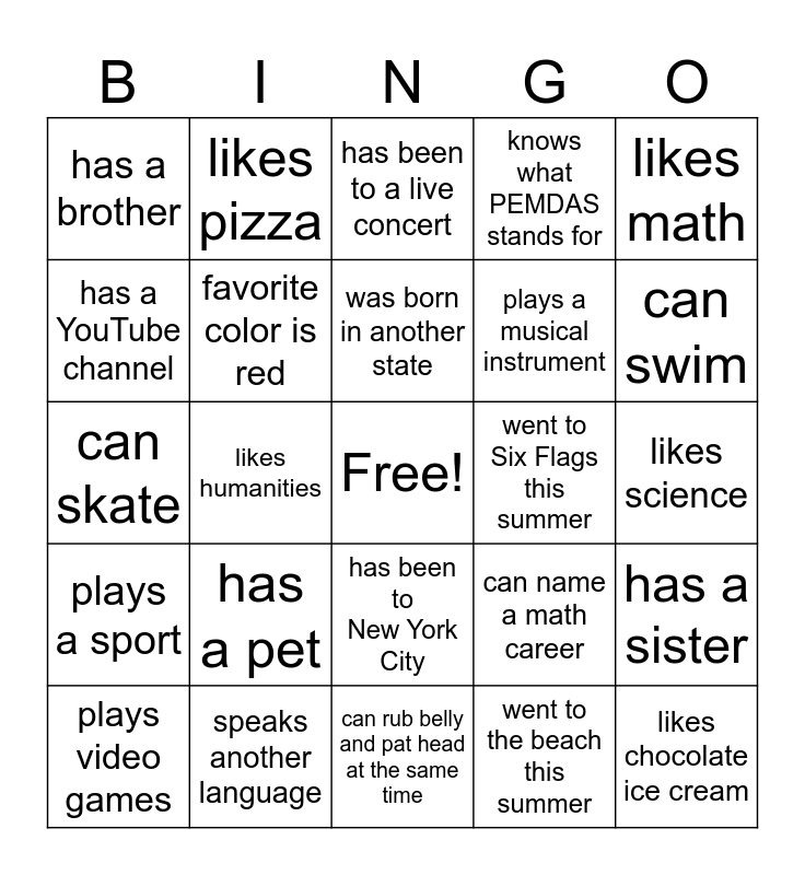 This bingo card has a free space and 24 words: has a pet, speaks another language, was born in another state, plays video games, likes math, has a brother, has a YouTube channel, likes pizza, went to Six Flags this summer, has been to New York City, plays a musical instrument, can skate, can name a math career, has a sister, favorite color is red, went to the beach this summer, likes science, has been to a live concert, can swim, likes humanities, likes chocolate ice cream, plays a sport, knows what PEMDAS stands for and can rub belly and pat head at the same time.