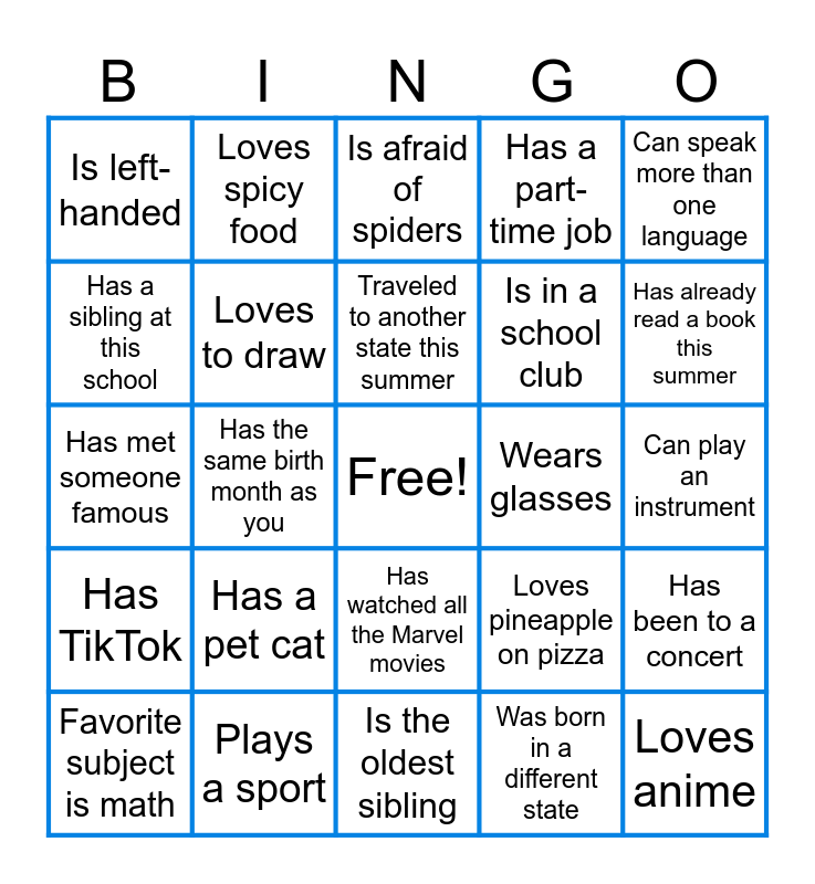 This bingo card has a free space and 24 words: Has a pet cat, Plays a sport, Traveled to another state this summer, Favorite subject is math, Can speak more than one language, Is left-handed, Has a sibling at this school, Loves spicy food, Wears glasses, Has watched all the Marvel movies, Is in a school club, Has met someone famous, Loves pineapple on pizza, Has been to a concert, Loves to draw, Was born in a different state, Can play an instrument, Is afraid of spiders, Has already read a book this summer, Has the same birth month as you, Loves anime, Has TikTok, Has a part-time job and Is the oldest sibling.