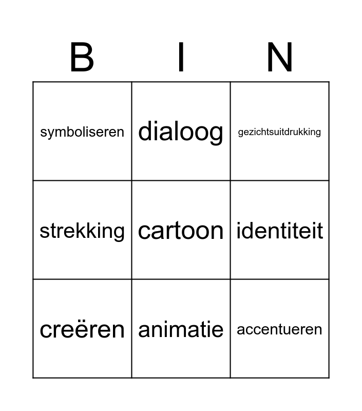 This bingo card has 11 words: accentueren, animatie, cartoon, creëren, dialoog, gezichtsuitdrukking, identiteit, illustreren, strekking, symboliseren and verfijnen.