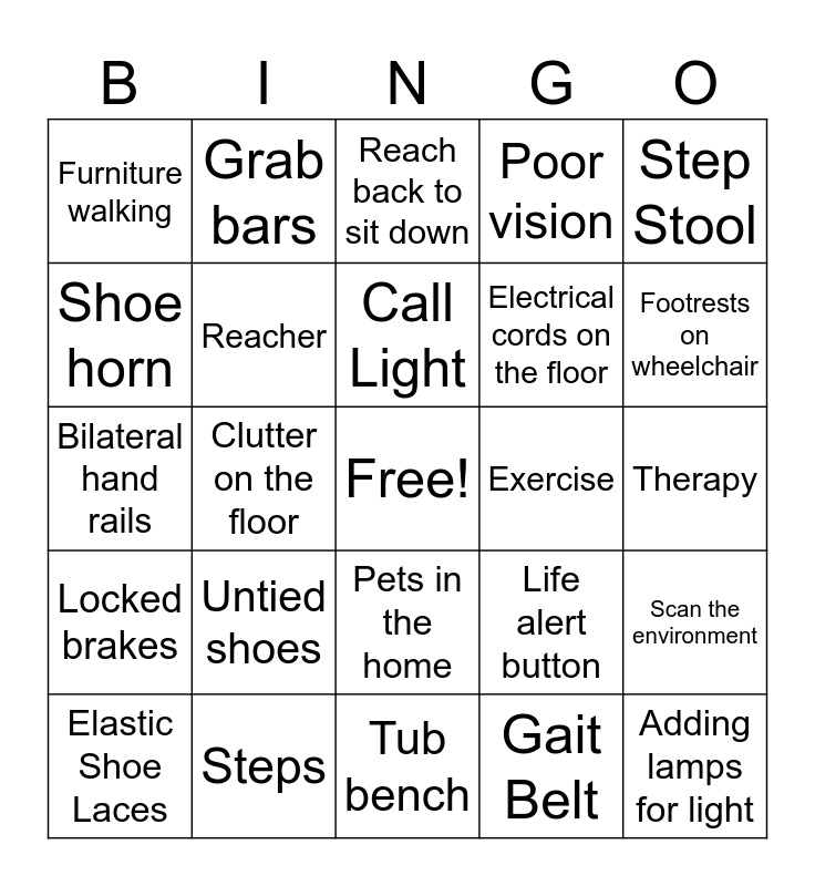 This bingo card has a free space and 24 words: Untied shoes, Steps, Call Light, Elastic Shoe Laces, Step Stool, Furniture walking, Shoe horn, Grab bars, Exercise, Pets in the home, Electrical cords on the floor, Bilateral hand rails, Life alert button, Scan the environment, Reacher, Gait Belt, Therapy, Reach back to sit down, Footrests on wheelchair, Clutter on the floor, Adding lamps for light, Locked brakes, Poor vision and Tub bench.