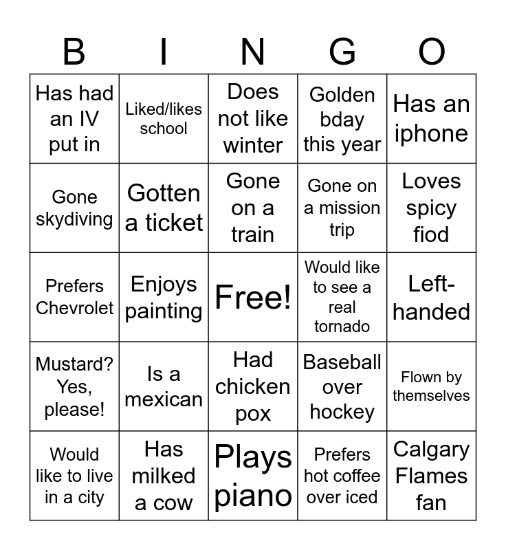 This bingo card has a free space and 29 words: Would like to live in a city, Loves thunder-storms, Enjoys painting, Over 6ft tall, Has had an IV put in, Does not like winter, Gotten a ticket, Is a mexican, Would like to see a real tornado, Has milked a cow, Left-handed, Calgary Flames fan, Plays piano, Prefers hot coffee over iced, Loves spicy fiod, Believes the earth is flat, Had chicken pox, Mustard? Yes, please!, Has an iphone, Prefers Chevrolet, Baseball over hockey, Rather go to the ⛰️ than to the ⛱️, Gone on a mission trip, Gone skydiving, Golden bday this year, Liked/likes school, Flown by themselves, Gone on a train and Thinks neatrul colors are boring.