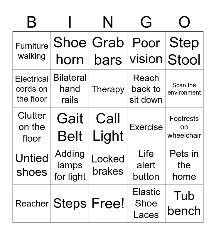 This bingo card has 25 words: Untied shoes, Steps, Call Light, Elastic Shoe Laces, Step Stool, Furniture walking, Shoe horn, Grab bars, Exercise, Pets in the home, Electrical cords on the floor, Bilateral hand rails, Free!, Life alert button, Scan the environment, Reacher, Gait Belt, Therapy, Reach back to sit down, Footrests on wheelchair, Clutter on the floor, Adding lamps for light, Locked brakes, Poor vision and Tub bench.