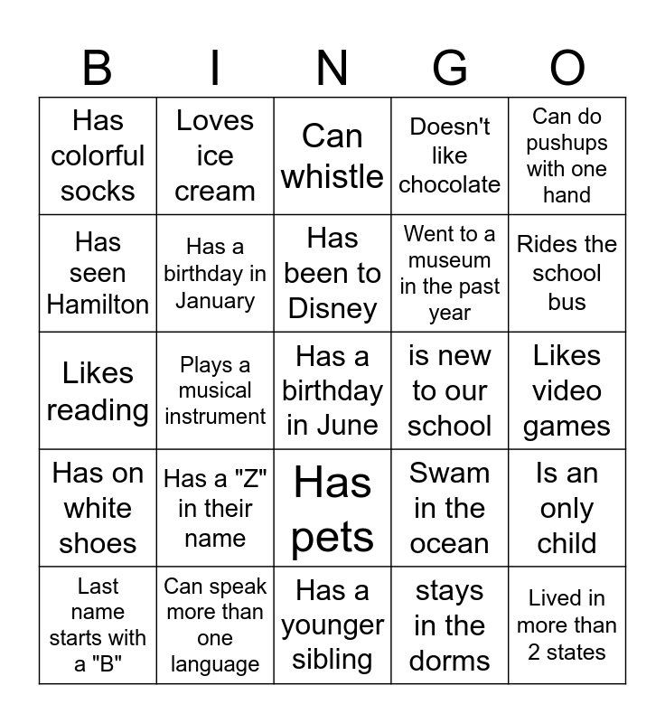 This bingo card has a free space and 29 words: Last name starts with a "B", Was not born in Arkansas, Plays a musical instrument, Plays soccer, Has colorful socks, Can whistle, Has a birthday in January, Has a "Z" in their name, is new to our school, Can speak more than one language, Likes video games, Lived in more than 2 states, Has a younger sibling, stays in the dorms, Rides the school bus, Likes art, Has pets, Has on white shoes, Can do pushups with one hand, Likes reading, Swam in the ocean, Has an older sibling, Went to a museum in the past year, Has seen Hamilton, Doesn't like chocolate, Loves ice cream, Is an only child, Has been to Disney and Likes to watch TV.