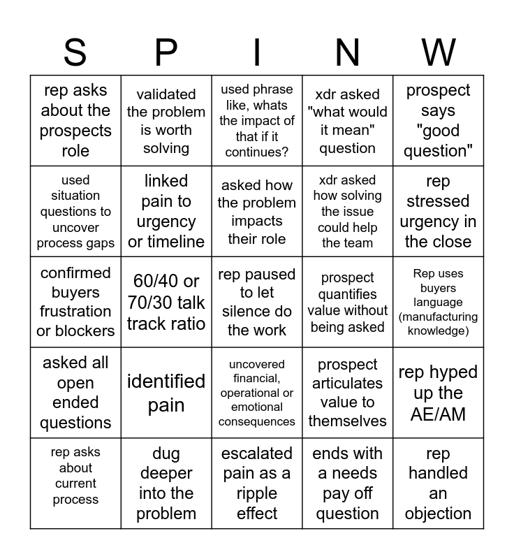 This bingo card has a free space and 24 words: rep asks about current process, identified pain, asked how the problem impacts their role, ends with a needs pay off question, prospect says "good question", rep asks about the prospects role, validated the problem is worth solving, used phrase like, whats the impact of that if it continues?, prospect quantifies value without being asked, Rep uses buyers language (manufacturing knowledge), confirmed buyers frustration or blockers, linked pain to urgency or timeline, prospect articulates value to themselves, rep hyped up the AE/AM, used situation questions to uncover process gaps, dug deeper into the problem, escalated pain as a ripple effect, xdr asked "what would it mean" question, rep stressed urgency in the close, asked all open ended questions, 60/40 or 70/30 talk track ratio, uncovered financial, operational or emotional consequences, xdr asked how solving the issue could help the team and rep handled an objection.