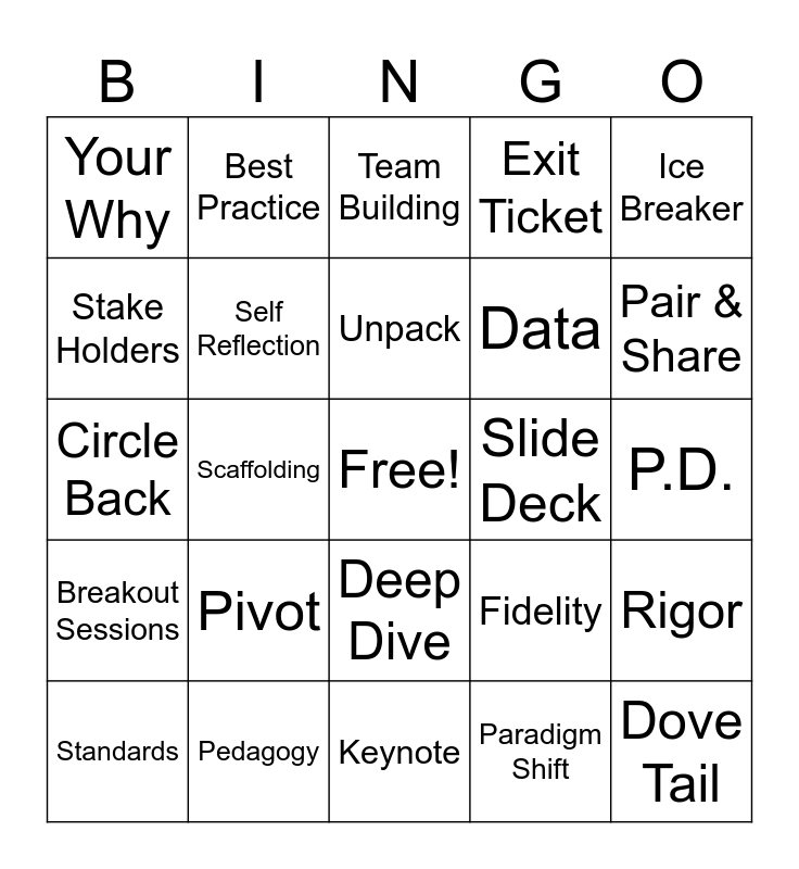 This bingo card has a free space and 24 words: Pivot, Pedagogy, Unpack, Standards, Ice Breaker, Your Why, Stake Holders, Best Practice, Slide Deck, Deep Dive, Data, Circle Back, Fidelity, Rigor, Self Reflection, Paradigm Shift, P.D., Team Building, Pair & Share, Scaffolding, Dove Tail, Breakout Sessions, Exit Ticket and Keynote.