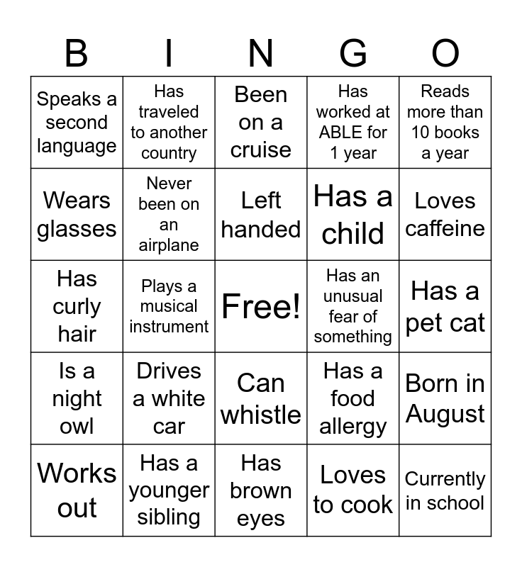 This bingo card has a free space and 24 words: Drives a white car, Has a younger sibling, Left handed, Works out, Reads more than 10 books a year, Speaks a second language, Wears glasses, Has traveled to another country, Has an unusual fear of something, Can whistle, Has a child, Has curly hair, Has a food allergy, Born in August, Never been on an airplane, Loves to cook, Has a pet cat, Been on a cruise, Loves caffeine, Plays a musical instrument, Currently in school, Is a night owl, Has worked at ABLE for 1 year and Has brown eyes.