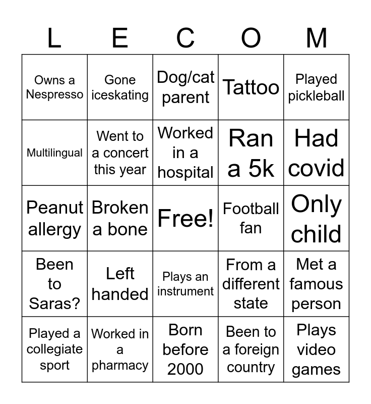 This bingo card has a free space and 24 words: Left handed, Worked in a pharmacy, Worked in a hospital, Played a collegiate sport, Played pickleball, Owns a Nespresso, Multilingual, Gone iceskating, Football fan, Plays an instrument, Ran a 5k, Peanut allergy, From a different state, Met a famous person, Went to a concert this year, Been to a foreign country, Only child, Dog/cat parent, Had covid, Broken a bone, Plays video games, Been to Saras?, Tattoo and Born before 2000.