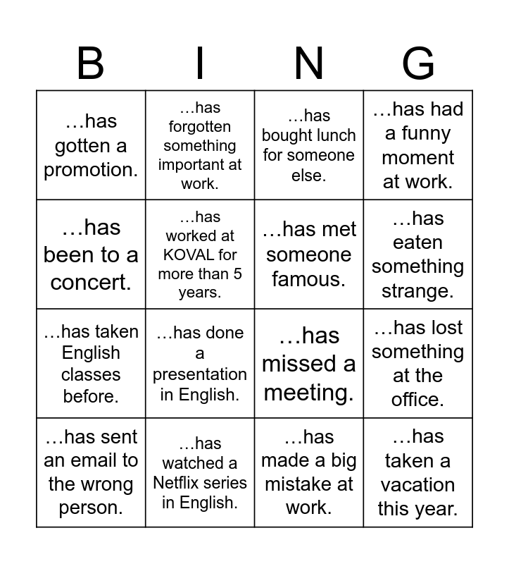 This bingo card has 25 words: …has visited another country., …has helped a coworker., …has eaten something strange., …has spoken English with a client., …has been to a concert., …has gotten a promotion., …has worked at KOVAL for more than 5 years., …has forgotten something important at work., …has watched a Netflix series in English., …has worked overtime., …has taken English classes before., …has missed a meeting., …has traveled with coworkers., …has danced at a company party., …has met someone famous., …has worked in customer service., …has made a big mistake at work., …has bought lunch for someone else., …has done a presentation in English., …has lost something at the office., …has sent an email to the wrong person., …has called a client in English., …has taken a vacation this year., …has had a funny moment at work. and …has participated in a company event..
