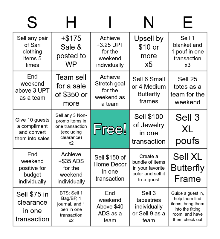 This bingo card has a free space and 24 words: Achieve +$35 ADS for the weekend individually, BTS: Sell 1 Bag/BP, 1 journal, and 1 pen in one transaction x2, Achieve Stretch goal for the weekend as a team, Sell $75 in clearance in one transaction, Sell 1 blanket and 1 pouf in one transaction x3, Sell any pair of Sari clothing items 5 times, End weekend above 3 UPT as a team, +$175 Sale & posted to WP, Sell $100 of Jewelry in one transaction, Sell $150 of Home Decor in one transaction, Sell 6 Small or 4 Medium Butterfly frames, Give 10 guests a compliment and convert them into sales, Create a bundle of items in your favorite color and sell it to a guest, Sell XL Butterfly Frame, Team sell for a sale of $350 or more, Sell 3 tapestries individually or Sell 9 as a team, Sell 3 XL poufs, Achieve +3.25 UPT for the weekend individually, Sell 25 totes as a team for the weekend, Sell any 3 Non-promo items in one transaction (excluding clearance) x2, Guide a guest in, help them find items, bring them into the fitting room, and have them check out, End weekend positive for budget individually, Upsell by $10 or more x5 and End weekend Above $40 ADS as a team.