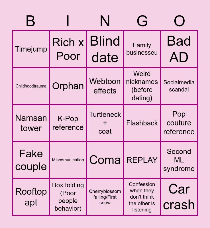 This bingo card has a free space and 50 words: Amnesia, Car crash, Bad english actors, Cherryblossom falling/First snow, Miscomunication, EX Causing problems, Rich x Poor, Secret relationship, Childhoodtrauma, Abroad, Orphan, Family businesseu, Second ML syndrome, REPLAY, Seceret identities, Slowmotion, Webtoon effects, Flashback, Bullying, Bad AD, K-Pop reference, Confession when they don’t think the other is listening, Timejump, Weird nicknames (before dating), Stupid FL, OST ft. famous K-pop artist, Socialmedia scandal, KDrama magic, Blind date, Coma, Arranged marriage, Fixing hair, Playing basketball, A grandma owning a shop/cart, Box folding (Poor people behavior), Dying relative, Relative taking care of ML, Typical FL/ML BFF, Slip up, Pop couture reference, Psycho vibes but it's ok because he's cute, Chicken + Somek, Piggyback, Goofy sound effect, Rooftop apt, Namsan tower, Rooftop drinking, Falling on top of each other (almost kissing), Fake couple and Kopiko.