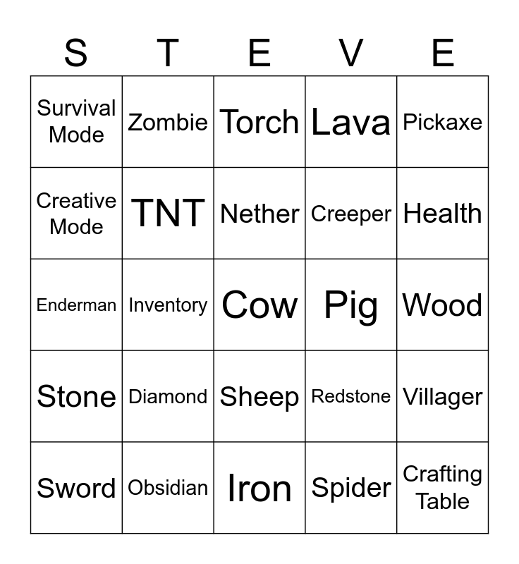 This bingo card has 25 words: Diamond, Iron, Nether, Sword, Pickaxe, Survival Mode, Creative Mode, Zombie, Pig, Sheep, Creeper, Enderman, Redstone, Villager, TNT, Crafting Table, Wood, Torch, Health, Inventory, Cow, Obsidian, Stone, Lava and Spider.