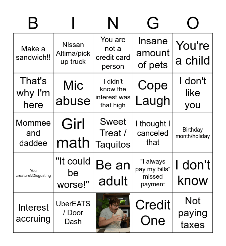 This bingo card has 1 images, a free space and 23 words: "It could be worse!", UberEATS / Door Dash, I didn't know the interest was that high, Interest accruing, You're a child, Make a sandwich!!, That's why I'm here, Nissan Altima/pick up truck, I thought I canceled that, Be an adult, Cope Laugh, Mommee and daddee, "I always pay my bills" missed payment, I don't know, Mic abuse, Credit One, Birthday month/holiday, You are not a credit card person, I don't like you, Girl math, Not paying taxes, You creature!/Disgusting and Insane amount of pets.