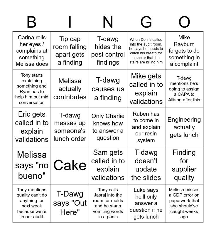 This bingo card has a free space and 24 words: Cake, T-Dawg says "Out Here", T-dawg causes us a finding, Tony mentions quality can’t do anything for next week because we’re in our audit, Mike Rayburn forgets to do something in a complaint, Carina rolls her eyes / complains at something Melissa does, Tony starts explaining something and Ryan has to help him out mid conversation, Tip cap room falling apart gets a finding, Ruben has to come in and explain our resin system, Sam gets called in to explain validations, Mike gets called in to explain validations, Eric gets called in to explain validations, T-dawg doesn’t update the slides, Finding for supplier quality, Melissa actually contributes, Luke says he’ll only answer a question if he gets lunch, Engineering actually gets lunch, T-dawg hides the pest control findings, T-dawg mentions he’s going to assign a CAPA to Allison after this, T-dawg messes up someone's lunch order, Melissa misses a GDP error on paperwork that she should've caught weeks ago, Melissa says "no bueno", When Don is called into the audit room, he says he needs to catch his breath for a sec or that the stairs are killing him and Tony calls Jasraj into the room for molds and he starts vomiting words in a panic.