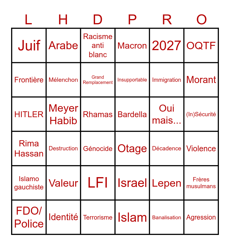 This bingo card has 36 words: Israel, LFI, Islam, Frontière, Rima Hassan, Bardella, Mélenchon, Terrorisme, 2027, Lepen, Morant, Macron, Frères musulmans, Meyer Habib, Insupportable, Juif, Islamo gauchiste, Oui mais..., HITLER, Racisme anti blanc, Rhamas, Destruction, Otage, Génocide, Décadence, Arabe, Immigration, Identité, Grand Remplacement, OQTF, Agression, FDO/ Police, Violence, (In)Sécurité, Valeur and Banalisation.