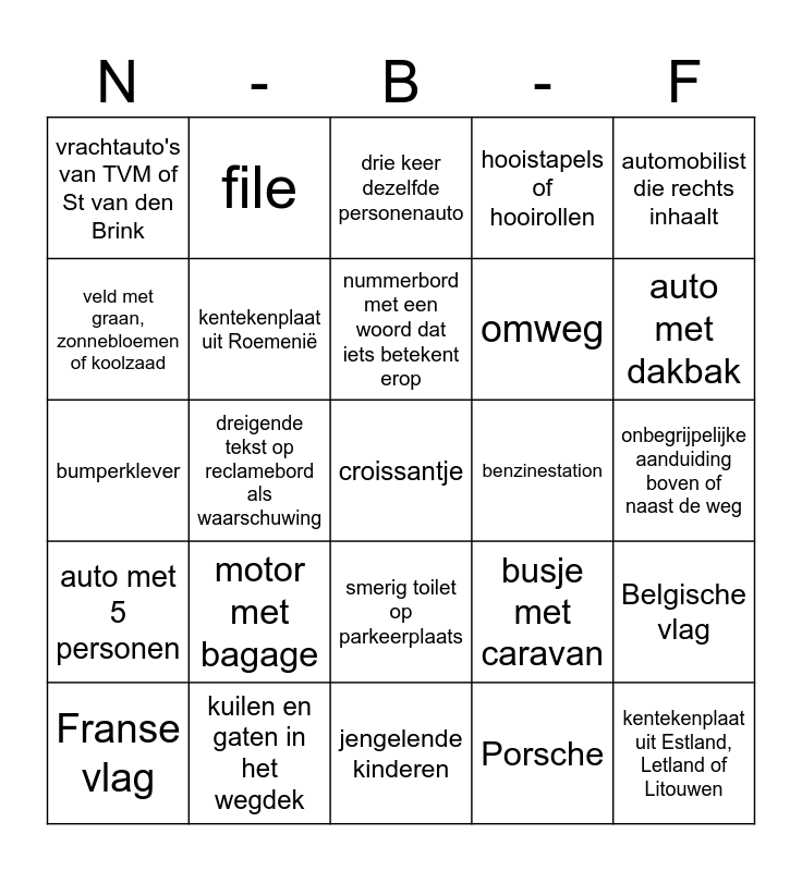 This bingo card has 30 words: kuilen en gaten in het wegdek, betonnen platen op de weg of lapjes asfalt, dreigende tekst op reclamebord als waarschuwing, uit het niets invoegende Belgische bestuurders, vrachtauto's van TVM of St van den Brink, drie keer dezelfde personenauto, kentekenplaat uit Roemenië, smerig toilet op parkeerplaats, benzinestation, jengelende kinderen, onbegrijpelijke aanduiding boven of naast de weg, croissantje, Porsche, kentekenplaat uit Estland, Letland of Litouwen, auto met dakbak, camper met aanhanger, busje met caravan, auto met 5 personen, motor met bagage, automobilist die rechts inhaalt, bumperklever, snelheids beperking, file, omweg, veld met graan, zonnebloemen of koolzaad, hooistapels of hooirollen, Belgische vlag, Franse vlag, nummerbord met een woord dat iets betekent erop and Nederlandse vlag.