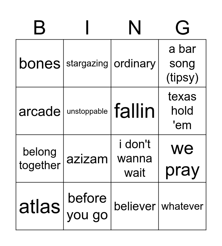 This bingo card has 20 words: we pray, thank you (not so bad), ordinary, euphoria, atlas, arcade, before you go, bones, belong together, stargazing, azizam, i don't wanna wait, unstoppable, whatever, fallin, beautiful things, texas hold 'em, a bar song (tipsy), believer and happier.