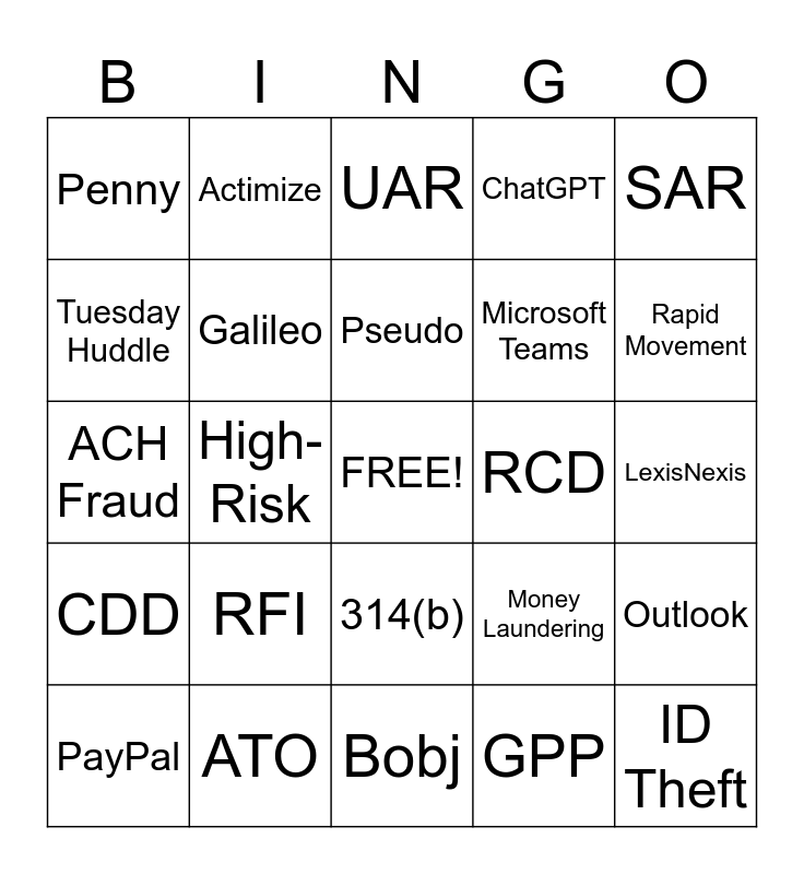 This bingo card has a free space and 24 words: RFI, ATO, Pseudo, PayPal, SAR, Penny, Tuesday Huddle, Actimize, RCD, 314(b), Microsoft Teams, ACH Fraud, Money Laundering, Outlook, Galileo, GPP, LexisNexis, UAR, Rapid Movement, High-Risk, ID Theft, CDD, ChatGPT and Bobj.