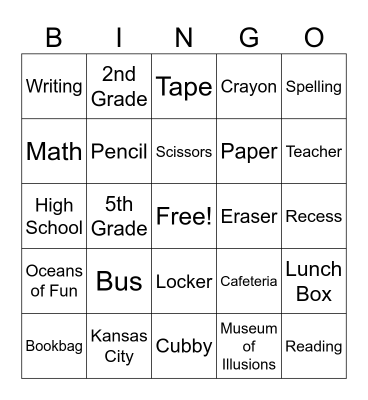 This bingo card has a free space and 60 words: School, Kansas City, Worlds of Fun, Oceans of Fun, Museum of Illusions, Negro Baseball Museum, Pencil, Pen, Paper, Marker, Crayon, Notebook, Math, Science, Social Studies, Writing, Reading, Spelling, History, Scissors, Eraser, Tape, Bookbag, Lunch Box, PE, Art Class, Glue, Pencil Sharpener, Teacher, Principal, Lunch Time, Field Trip, Kindergarten, 1st Grade, 2nd Grade, 3rd Grade, 4th Grade, 5th Grade, Middle School, High School, Elementary School, Bus, Recess, Library, Cafeteria, Hallway, Counselor, Pencil Case, Desk, Locker, Cubby, Circle Time, Bulletin Board, Homework, Playground, Colored Pencils, Stickers, Folder, Push Pins and Paper Clip.